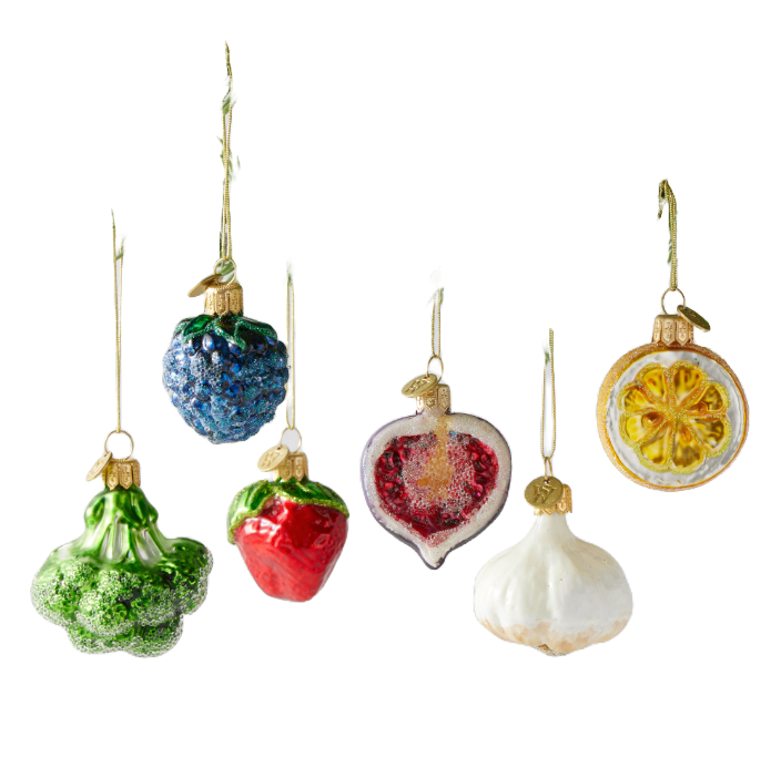 • A table setting with a green floral tablecloth, blue and white plates, an orange with green leaves, bamboo-handled utensils, and a copper goblet. There's a red floral centerpiece.